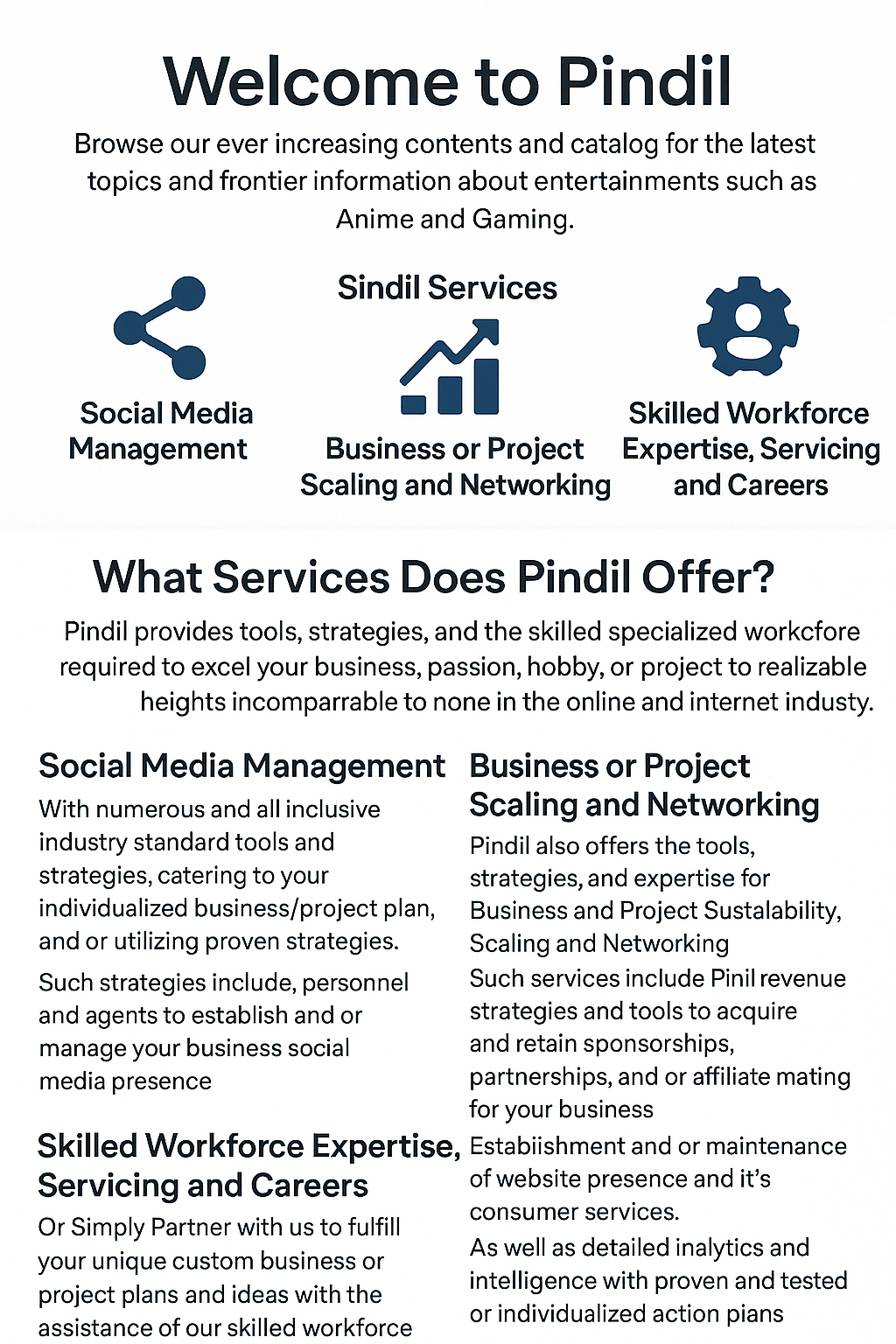 Pindil provides tools, strategies, and the skilled specialized workforce required to excell your business,passion,hobby, or project to relizable heights incomparable to none in the online and internet industry.